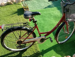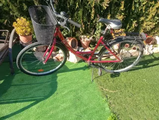 Bicicleta urbana de color rojo, ideal para paseos y desplazamientos diarios. - Cesta delantera negra. - Guardabarros delantero y trasero. - Portabultos trasero.
