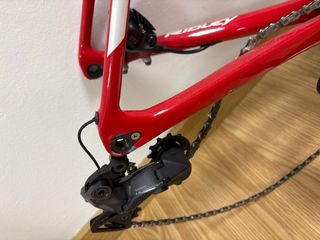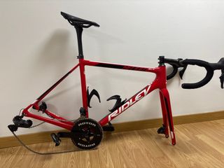Cuadro de bicicleta de carretera Ridley Helium SLX en color rojo. - Cuadro de carbono. - Talla S. - Incluye tija de sillín, manillar y potencia. - Frenos de disco. - Bielas Rotor. - Cambio Shimano Ultegra.de 12 V El grupo esta nuevo co. Unos 500km El cuadro tiene algunos reces pero no muy visibles