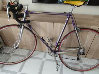 Bicicleta de carrera de la marca Nortelle con un llamativo diseño morado y detalles amarillos. Es una reliquia. Se le acaba de cambiar la cadena nueva, frenos nuevos, separadores.. - Cuadro de color púrpura con detalles gráficos. - Sillín amarillo. - Ruedas con aro rojo.
