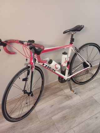 Bicicleta de carretera Trek en color blanco y rojo. Se encuentra en perfecto estado, prácticamente sin uso. - Cuadro de aluminio. - Ruedas de 700c. - Frenos de disco. - Cambio Shimano.