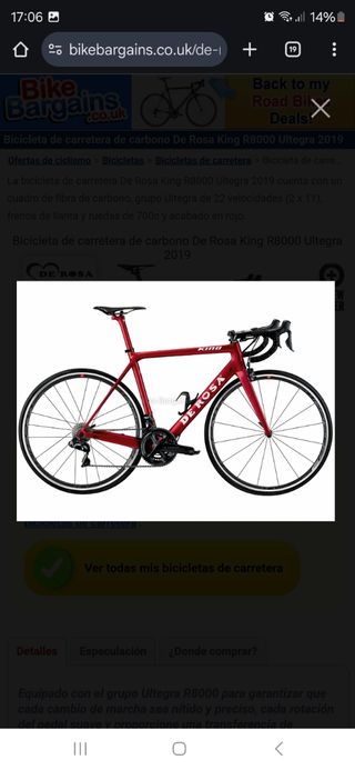 Bicicleta De Rosa King R8000 Ultegra 2019 en estupendo estado. Es una bicicleta de carretera de carbono, con grupo Ultegra R8000 para cambios precisos. - Cuadro de fibra de carbono. - Grupo Shimano Ultegra R8000. - 22 velocidades (2x11). - Llantas de 700c. - Acabado en rojo.