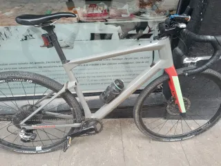 Bicicleta de gravel con cuadro Orbea Terra de aluminio ( Las primeras Terra de Orbea).El cuadro es un cuadro de aluminio pintado en negro. Grupo Shimano 105 mecánico de 10 velocidades 11-32. Horquilla ( Zeus),tija y potencia (FSA)de carbono. Ruedas DT Swiss 460Rd de aluminio, robustas y fiables. Cubiertas Vittoria Terreno Zero tubelizadas de 40 mm. ( El paso de rueda acepta 42-44) Platos 46-36. Talla 54 ( M). Yo mido 1.81m. Mantenimiento y cuidados al día. Limpieza de cadena y casette tras cada salida. Ha sido mi bicicleta de bikepacking con la que he ido muy cómodo. Pedales XT y adaptador Garmin del manillar incluidos.