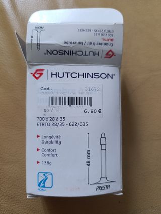 Cámara de aire Hutchinson para bicicleta de carretera. - Modelo: 700 x 28 a 35 - Válvula: Presta de 48 mm - Material: Butilo - ETRTO: 28/35 - 622/635 - Peso: 138g - Durabilidad y confort 3 recamaras por 5€