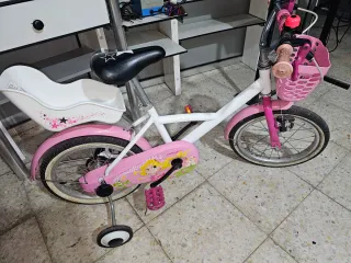 Bicicleta infantil en color blanco y rosa, ideal para las más pequeñas. Cuenta con ruedines para facilitar el aprendizaje y una cesta delantera para llevar sus tesoros. - Sillín negro con estrella blanca. - Cesta rosa. - Ruedines incluidos. - Diseño con estrellas y princesas.