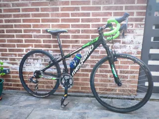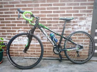 Bicicleta en color rojo, apta para adultos y jóvenes. Ideal para paseos y rutas. La compre en su dia para ir al gimnasio y dar una vuelta, a dia de hoy no le doy uso. Mido 1,87. Y subiendo el sillin se puede utilizar con mi altura sin problema, aunque si eres mas bajo siempre sera mejor. - Cuadro de aluminio. - Suspensión delantera. - Frenos de disco. - Ruedas todoterreno.