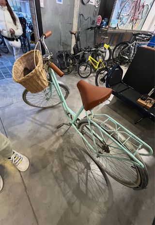 Bicicleta de paseo en color menta, con sillín y puños en tono marrón. - Cuadro de paseo. - Ruedas de 26 pulgadas. - Guardabarros delantero y trasero. - Pata de cabra. Esta como nueva, la vendo por mudanza