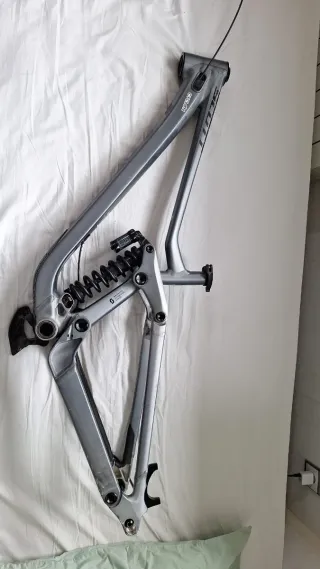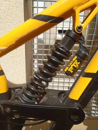 Funciona perfectamente. Lista para rodar. Especificaciones y detalles: • Cuadro de aluminio de doble suspensión, muy resistente, talla estándar downhill. • Horquilla delantera Marzocchi Bomber, 200 mm de recorrido, ideal para terrenos técnicos. • Amortiguador trasero con gran absorción, perfecto para saltos y descensos duros. • Frenos de disco hidráulicos para máxima seguridad y potencia de frenada. • Ruedas de 26” con cubiertas Maxxis en buen estado, excelente agarre. • Transmisión completa, cambios suaves y precisos. • Pedales anchos de aluminio • Sillín con un pequeño roto (visible en las fotos) pero todavía funcional