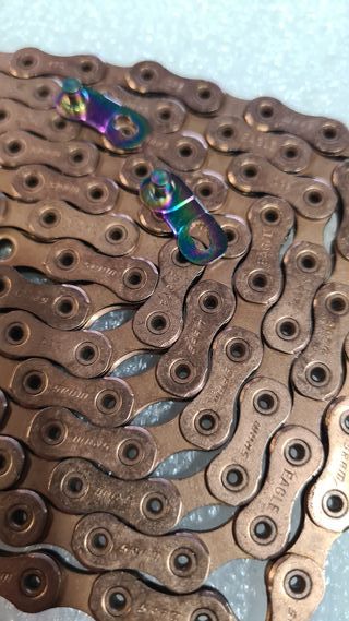 Cadena SRAM XX1 Eagle de 12 velocidades en acabado bronce. Cadena Original Nueva a estrenar. Somos tienda. TIENDA ESPECIALIZADA COMPRUEBE NUESTRAS RESEÑAS EN WALLAPOP Puedes pagar por bizum añadiendo 9€ para el envío. podemos juntar varios articulos y pagar un solo porte Nuevo a estrenar con factura y garantia piezas repuestos recambios bici bicicleta montaña mountain bike mtb xc xco rally maratón marathon allmountain trail enduro dh descenso downhill retro vintage mtb vtt btt clasica classic old school sram Shimano Campagnolo orbea scott cannondale trek specialized oakley - Color bronce - 12 velocidades - Modelo XX1 Eagle
