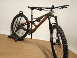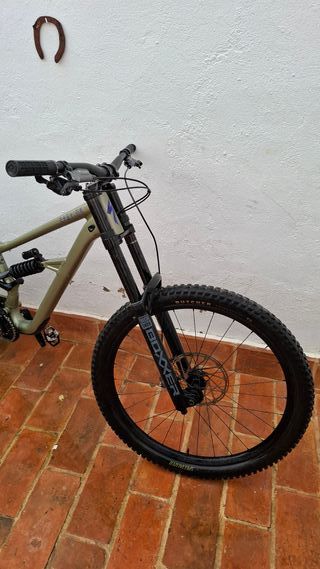 Specialized Status S5 en color verde militar. Diseñada para descensos (DH). Freno delantero: SRAM Maven Bronze, pinza de 4 pistones, disco hidráulico, 220mm Freno trasero: SRAM DB MVN BRZ SJ BDPA DIR Amortiguador trasero: RockShox Super Deluxe Select Coil, ajuste de rebote externo, fondo hidráulico, 230x62,5mm Horquilla: RockShox BoXXer 29, amortiguador Charger 3 RC, compresión ajustable a baja velocidad, rebote ajustable, eje pasante de 20x110mm, desplazamiento de 44mm, 180mm de recorrido Como NUEVA muy poco uso, sin golpes. Talla S5 (LX) Cuadro de aluminio. Horquilla RockShox Boxxer.