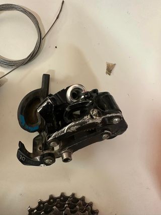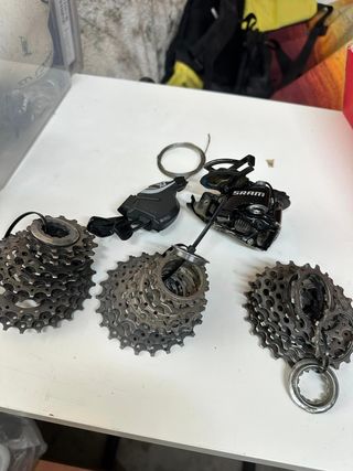 Conjunto de trasmisión para bici de descenso DH, compuesto por cambio X0 caja corta carbono ) roldanas cambiadas por unas como nuevas , mando X7 de 10v (tengo varias abrazaderas de manillar), piñon ultegra o durace 11-23 o 11-25 (tengo varios), cadenas de 10v tengo varias que podria regalar (depende de la longitud que necesites). Aparte tengo varios guiacadenas como un Gamut, cubreplatos etc