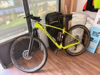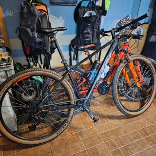 Bicicleta de montaña con un llamativo color naranja. Ideal para disfrutar de rutas y senderos .Se vende por falta de uso, usada dos veces. La bici está nueva. Ver y probar - Cuadro de carbono. - Suspensión delantera y trasera. - Ruedas de 29 pulgadas. - Frenos de disco hidráulicos. Precio negociable.