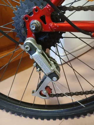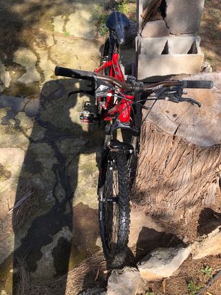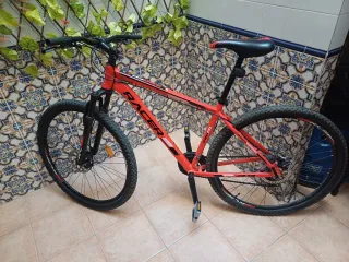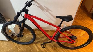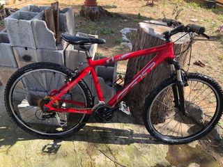 Bicicleta de montaña de color rojo, ideal para paseos y aventuras. - Cuadro de aluminio. - Suspensión delantera. - Frenos de disco. El freno suena al usarlo y el manillar esta un poco desapretado