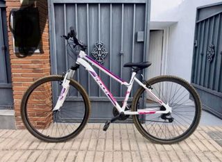 Bicicleta de montaña en buen estado, con poco uso. Ideal para iniciarse en el ciclismo. Mujer - Cuadro de aluminio blanco con detalles morados. - Suspensión delantera.