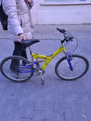 Bicicleta de montaña con doble suspensión, ideal para terrenos irregulares. Su diseño combina colores llamativos para destacar. - Cuadro amarillo. - Horquilla delantera azul. - Ruedas de 26 pulgadas. - Frenos de disco. La bicicleta no funciona desde un buen tiempo y le hace falta arreglos o para despiece. No entiendo nada de bicicletas, pero en su tiempo costó un dineral. Se puede ver sin compromiso! Entra en mi perfil para cositas Baratas y de Calidad!!!