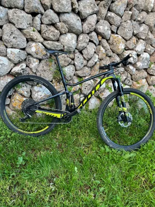 Bicicleta de montaña Scott Spark RC900 Pro Talla M - Cuadro de carbono vinilado completo desde el primer día. - Ruedas 29 Pulgadas Syncros. - Manillar syncros de carbono. - Bielas Sram de carbono. - Suspensión delantera y trasera Fox Recien revisadas. - Frenos XT. - Transmisión Sram. - Tija telescópica Syncros. Bicicleta recién salida del taller con revisión completa.