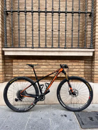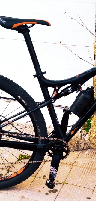 Bicicleta de montaña KTM de color naranja, ideal para senderos y rutas. - Cuadro de carbono. - Suspensión delantera y trasera. - Ruedas de 29 pulgadas. - Frenos de disco hidráulicos. - Transmisión SRAM NX.