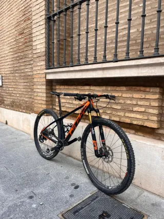 Bicicleta de montaña KTM Scarp en color negro y detalles rojos. - Cuadro de carbono. - Ruedas de 29 pulgadas. - Suspensión delantera y trasera fox - Frenos de disco hidráulicos xt - Transmisión gx