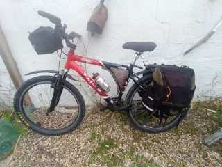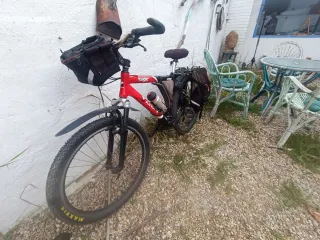 Bicicleta de montaña MMR en color rojo, Modelo Magic. lista para tus aventuras. - Cuadro de aluminio. - Ruedas Maxxis. - Incluye portabultos delantero y trasero. - Bolsa de sillín. - Bolsa delantera. - Bidón de agua.