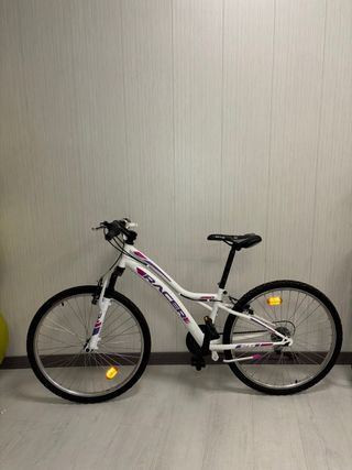 Bicicleta de montaña en talla S/M. Ideal para iniciarse en el ciclismo. - Cuadro blanco con detalles en rosa. - Ruedas de 26 pulgadas. - Portabidón amarillo.