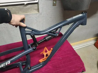 Cuadro de bicicleta de montaña Rockrider AM50s de 29 pulgadas, talla L. Diseñado para ofrecer un rendimiento robusto y fiable. - Color gris oscuro. - Amortiguador incluido Manitou. - Preparado para horquilla de 29 pulgadas. - Se entregaria con dos patillas de cambio de repuesto. Esta usado pero en perfecto estado, tiene arañazos pequeños. Puede llevar horquillas hasta 160 mm. Es cuadro de aluminio, talla L.