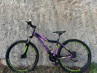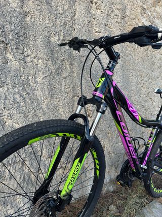 Bicicleta de montaña Coluer Alice con ruedas de 27,5 pulgadas. - Cuadro de aluminio. - Frenos de disco. - Suspensión delantera. - Diseño en negro con detalles en morado y verde lima. - Talla S. Esta impecable!!