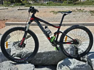 Vendo mi bicicleta con pedigrí Canyon Lux MR, talla S, una auténtica máquina de doble suspensión fabricada íntegramente en carbono. La vendo porque he decidido pasarme al ciclismo de carretera y, además, la montaña resultó demasiado técnica para mí, por lo que apenas la he utilizado, revisada y puesta a punto. Cuadro: Carbono Suspensión: Doble suspensión con tija de gas trasera Manillar: Synlace Vector Frenos: Shimano XTR Cambio: Shimano XTR Pedales: Shimano Ruedas: Mavic SLR Extras incluidos: 2 cubiertas de regalo - Rasguño estético (última foto)