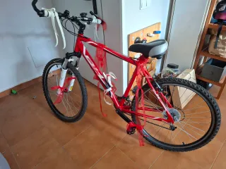 Bicicleta BH Over X en color rojo, ideal para iniciarse en el ciclismo de montaña. Una de las mejores bicicletas relación calidad precio. Procede de equivocación en regalo niño. Está nueva. - Cuadro de aluminio. - Suspensión delantera bloqueante. - cambio Shimano Deore. - Llanta 26". - Talla M.