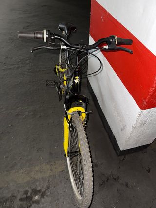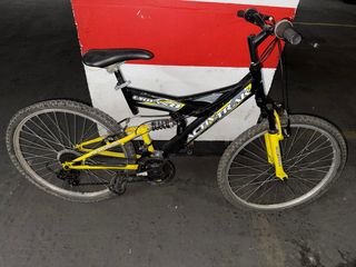 Bicicleta de montaña con un diseño llamativo en negro y amarillo. - Cuadro robusto. - Ruedas de buen tamaño. - Suspensión delantera y trasera. ** Está bien, el defecto que tiene es el sillín se ve en la foto que está subida