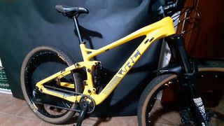 Bicicleta de montaña de color amarillo vibrante. Integral de Carbono, Talla L. tubelizada, Suspension rock Shox. Cambio Sram GX Badajoz y alrededores venta directa en persona Regalo otras dos cubiertas (no tubelizables) y transporte de portón de vehículo sin usar.
