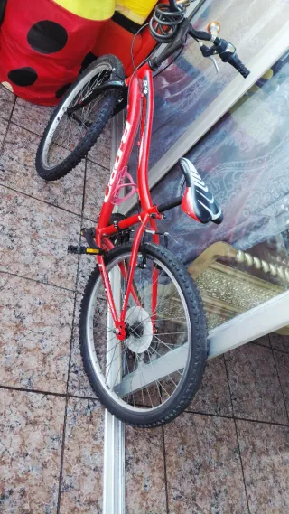 Bicicleta de montaña de color rojo, ideal para paseos y terrenos variados. Cuenta con un diseño robusto y componentes funcionales. - Cuadro de metal resistente. - Ruedas todoterreno. - Frenos de mano. - Sillín ajustable.