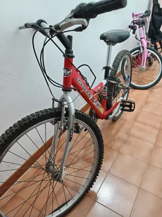 Vendo 2 bicis en buen estado las dos frenan bien una por 80E las dos 120E Bicicleta de montaña con cuadro de aluminio y horquilla delantera roja. - Cuadro de aluminio plateado y negro. - Horquilla delantera de color rojo. - Ruedas de 26 pulgadas. - Sillín negro con detalles rosas.