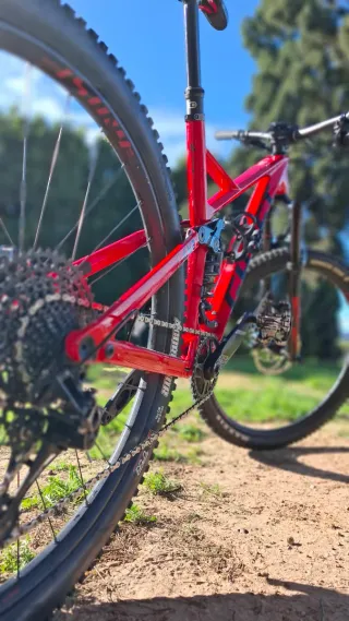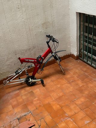 Bicicleta de montaña en buen estado, lista para la acción. - Cuadro de color rojo vibrante. - Suspensión delantera y trasera. - Frenos de disco. - Ruedas todoterreno.
