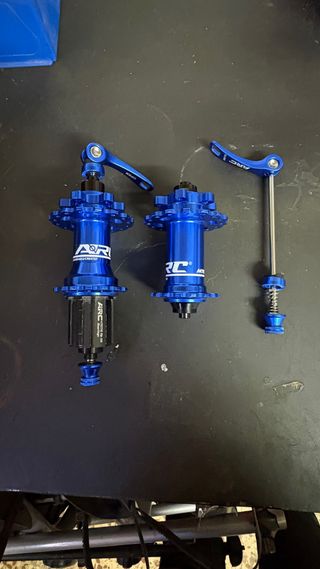 Set de bujes ARC de aluminio en color azul para bicicleta de montaña. - Bujes delanteros y traseros. - Cierres rápidos incluidos. - Diseño ligero y resistente. 32 agujeros cada buje Delantero 110mm Trasero 150mm Piñonera 40 mm