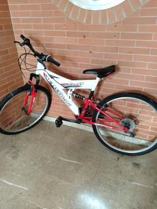 Características de la bicicleta 1. Tipo: MTB (montaña), de doble suspensión (delantera y trasera). 2. Cuadro: Aluminio. 3. Suspensión trasera: Amortiguador con resorte. 4. Transmisión: • Puños de cambio Shimano Revoshift (giro en el manillar). • Cambio trasero Shimano. 5. Frenos: Mecánicos tipo V-Brake. 6. Ruedas: 26 pulgadas (estándar en MTB). Estado general: -Le falta la rueda delantera. - Antigüedad 10 años. Se encuentra en buen estado a pesar del tiempo. Se usó unas 5 veces. Se vende por no poder usar por lesión de cadera. Escucho ofertas.