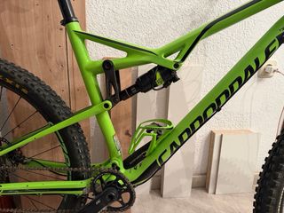 Bicicleta de montaña Cannondale de color verde brillante. Ideal para senderos y rutas. - Cuadro de Carbono. - Suspensión delantera y trasera. - Frenos de disco. - Ruedas Maxxis. tubeless