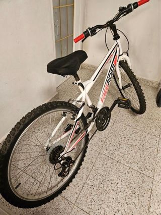 Bicicleta en buen estado, perfecta para paseos y uso urbano. Marca: FREERIDER 24x195 Colo: blanco con detalles en rojo y negro Frenos Incluye GRATIS funda acolchada para el asiento, para mayor comodidad. Precio NO negociable.
