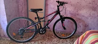 Bicicleta de montaña con doble suspensión y ruedas de 24 pulgadas. - Cuadro negro y detalles en azul. - Frenos delanteros y traseros. - Sillín negro ajustable. PRECIO NO NEGOCIABLE