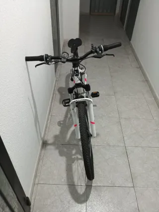 Bicicleta de montaña con un diseño moderno y deportivo. - Cuadro de aluminio plateado y detalles en color morado y rosa. - Ruedas todoterreno. - Sillín negro. - Puños negros. Se ha utilizado muy poco y lleva bastante tiempo en el trastero sin darle uso. Incluye el casco que aparece en la foto.