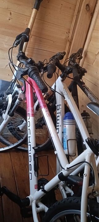 Bicicleta BTWIN de montaña, tamaño de rueda 26 pulgadas. Ideal para paseos y rutas. Habria que cambiar la goma de las ruedas, del tiempo se han desinflado, no se si estan pinchadas. - Cuadro de aluminio. - Suspensión delantera. - Frenos de disco. - Cambio Shimano. - Sillín cómodo. - Incluye portabidón.