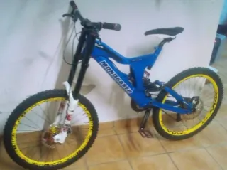 Bicicleta de montaña Mondraker Kaiser DH. - Cuadro de aluminio azul. - Horquilla delantera de doble pletina. - Ruedas con llantas amarillas. Deemax -horquilla marzocchi 888 -amortiguador marzocchi