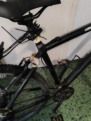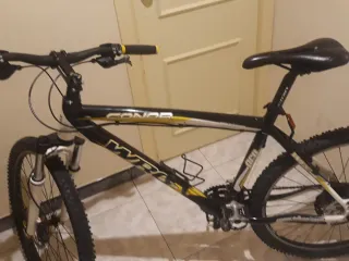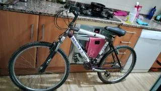 Bicicleta de montaña con un diseño moderno y deportivo. - Cuadro de aluminio en dos tonos. - Horquilla delantera con suspensión. - Ruedas de 26 pulgadas. - Frenos de disco. He intentando dejarlo lo mejor que he podido he cambiado ruedas y frenos pero aún le queda alguna cosita por hacer