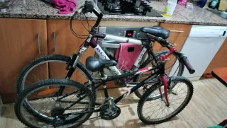Se venden dos bicicletas de montaña. - Una bicicleta de color morado y blanco. - Una bicicleta de color negro y rojo.