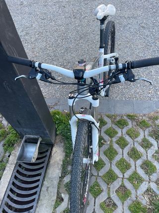 Bicicleta de montaña CUBE talla S con cuadro blanco y detalles en azul y rojo. - Cuadro de carbono C:62 perfecto estado con alguna marca estetica. - Horquilla Fox 32 stepcast bloqueo en manillar. - Frenos de disco, delantero 4pistones 2 detras. - Bielas de 155mm. - Tija y manillar de carbono. - Ruedas tubelizadas. - Sillin de gel. - Monoplato 11vel. Se vende por no usar, todavia tiene las pegatinas de nueva.