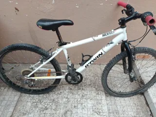 Bicicleta de montaña de la marca Decathlon, ideal para iniciarse en el ciclismo. - Cuadro de aluminio. - Ruedas de 26 pulgadas. - Frenos V-brake. - Cambio Shimano.