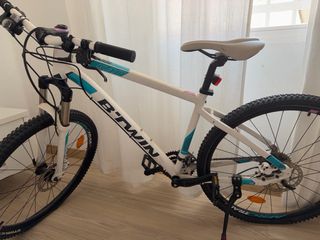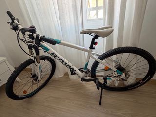 Bicicleta de montaña Rockrider 100 en color blanco y rosa. Ha sido usada muy pocas veces. - Cuadro de aluminio. - Ruedas de 27.5 pulgadas. - Frenos de disco. - Suspensión delantera.