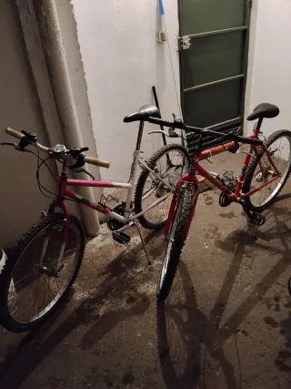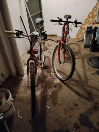 Acepto ofertas sin compromiso , PRECIO AJUSTABLE. Realiza tú oferta, y lo vemos Precio por unidad Bicicletas de montaña con cuadro rojo marca Shimano, y otra negra, marca America, de 26 las dos Están con las ruedas desinchadas, bien cuidadas, llevan tiempo sin usar, por 10€ c/u más doy un par de ruedas enteras de cada una, y por 90€ en total, doy también una plegable - Ruedas todoterreno. - Frenos de mano