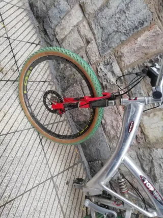 Bicicleta de montaña con un diseño llamativo. - Cuadro de aluminio plateado. - Ruedas con llantas de color y cubiertas verdes. - Sillín negro con detalles rojos. - Amortiguación delantera y trasera. -Cambio shimano