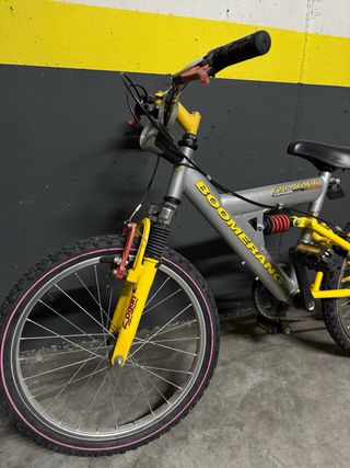 Bicicleta Boomerang para niñ@s, de 20 pulgadas, en muy buen estado. Es una bicicleta de montaña (MTB) con suspensión delantera y trasera. - Modelo Boomerang Y20-Attack. - Llantas de color amarillo y detalles en rosa. - Suspensión delantera y trasera.