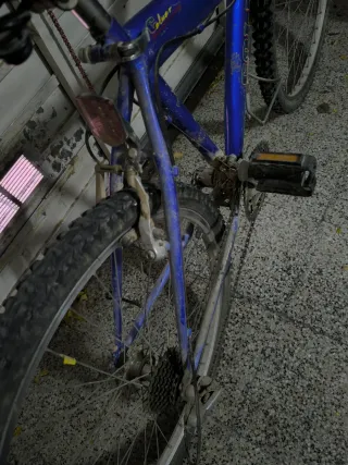 Bicicleta de color azul. Tiene sus años y algunos desperfectos, por eso el precio.