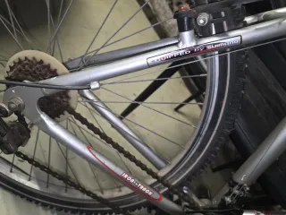 Bicicleta de montaña en buen estado, con un acabado plateado brillante. - Cuadro de metal. - Ruedas todoterreno. - Sillín negro. - Manillar plateado.